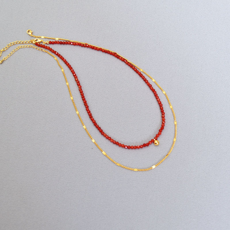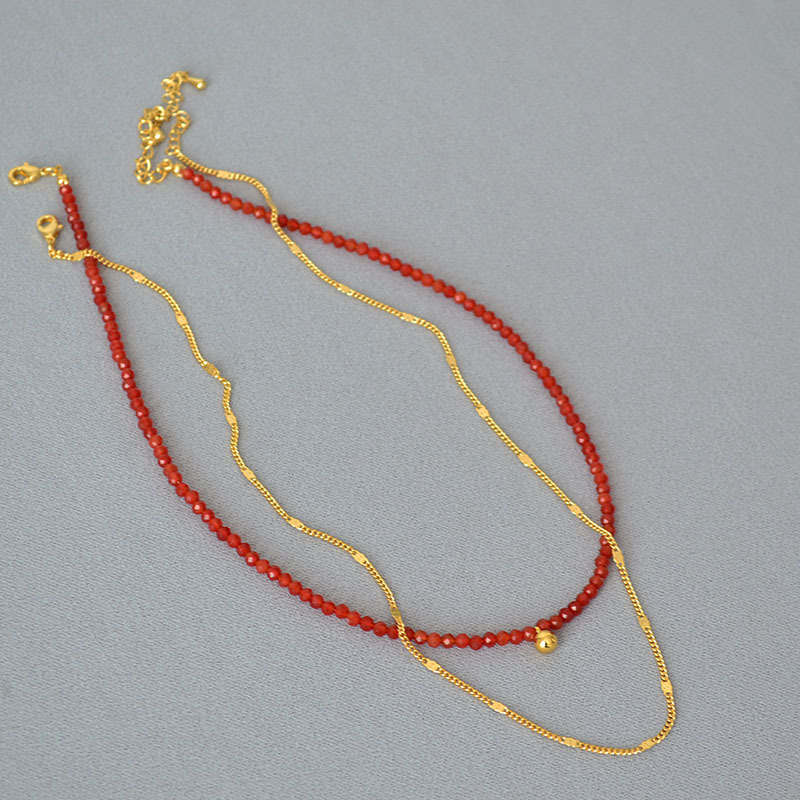 Shimmering Double-Layer Necklace Featuring Red Agate And Small Gold Beads